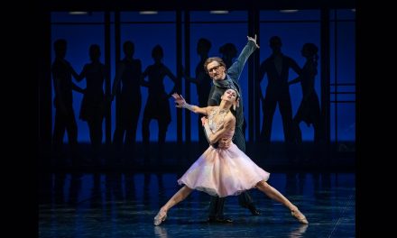 Dressed in gauzy white costumes designed by Marion Talan de la Rosa, the dancers seem to illuminate the stage while constantly swinging their arms in a repetitive movement that mesmerizes rather than bores. Neenan uses repetition successfully throughout the piece while interspersing the choreography with intricate patterns, solos, and duets. Again, this is ballet based with a contemporary flair and whimsical style all performed with great panache by the dancers. Because of his extensive ballet background Neenan uses lifts comfortably and often including one breathtaking moment when a male dancer lifts a female dancer over his back and suspends her mid-air as if momentarily frozen in place until he lifts her even higher before she slowly descends. It is a singular moment and one I will not forget anytime soon.