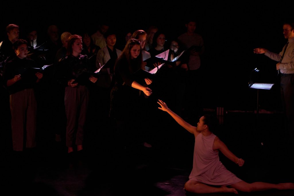 Through the evening, the choir joined the space, participating in each piece with blocking that did enhance the collaborative spirit. But it seemed as though the dancers weren’t dancing to the music: I’ll concede that choral music may not be the simplest for set counts but listening lacked in each of the pieces. And even when their faces were actively performing, the expression didn’t translate to the dancers’ eyes (Padeo and Songhorian, exceptions). Costumes mostly pulled from the experience—but for an independent production on a low budget, the effort was valiant and the thesis hopeful. This space opened a place for young artist to present their work and collaborate with composers; perhaps it just needed a bit more time and a touch more intention.