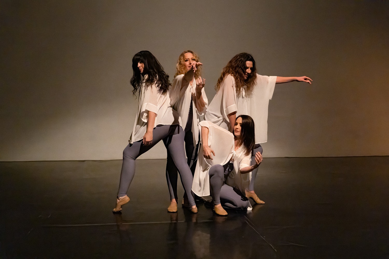 Following intermission, Elsie Neilson premiered her work titled “What Lies Beneath” set to music by Tamburi Neri and Hiroko. At first it was difficult to tell exactly how many bodies were entangled into one dark entity but as it began to disassemble itself, three separate women dress identically in black with a dash of red seeping from beneath their lace tops. The image of the entity disassembling helped explain how internal emotions gradually rise to the surface in all of us.