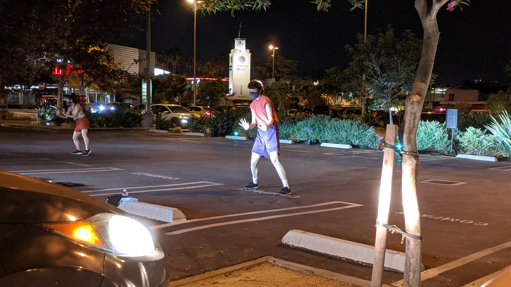 As anyone who has been following dance in Los Angeles knows, choreographers have been utilizing Zoom, Instagram and Facebook Live, streaming dances online to present their work to audiences who are quarantined at home. On Friday evening, October 2, 2020, Laurie Sefton was one of several choreographers who has returned to an old idea made popular in the 1950s, the drive-in, by presenting Breathe in the north parking lot of The Original Farmers Market in LA with an original music score by Bryan Curt Kostors performed live.