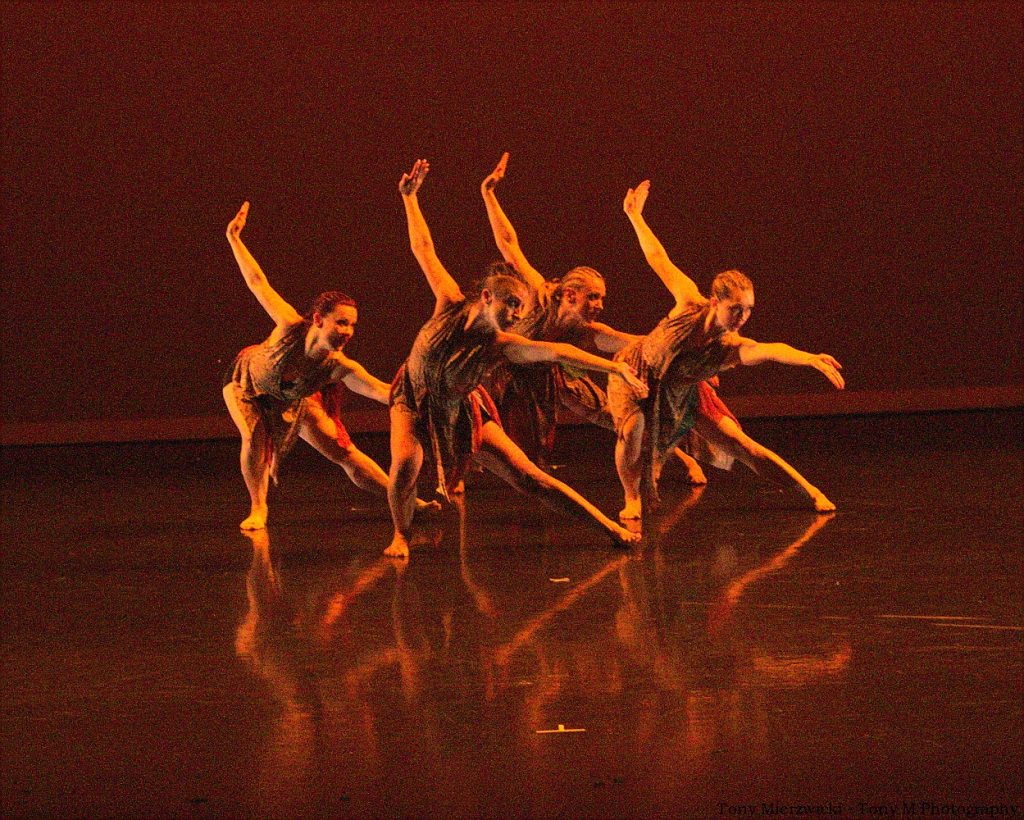 and Janell Burgess. This type of strong contemporary-jazz dance is a favorite of mine to watch, not to mention the use of Sarah McLachlan’s ever-chilling vocals in “Mercy” and “Witness.” The work featured 5 dancers in grey and one in red, creating an obvious separation between the group and the outcast. The piece insinuated that the dancer in red was tainted or dangerous or simply different (as the color often signifies blood, fire, love, desire, lust, strength, courage, malice). The group in grey was more emotionless, likely untouched by the real world or the experiences that have isolated the person in red. Perfectly in sync with one another, these dancers created beautiful lines and displayed stellar musicality as their emotion radiated off the stage towards us. There was a sense of “will they, won’t they” energy about this work while watching to see if the characters in grey would finally accept the one in red. They left her on the stage, however, alone and rejected. “Witness” was extremely beautiful and the dedication made to Christine Baltes was heartwarming, and an added touch to the masterpiece.