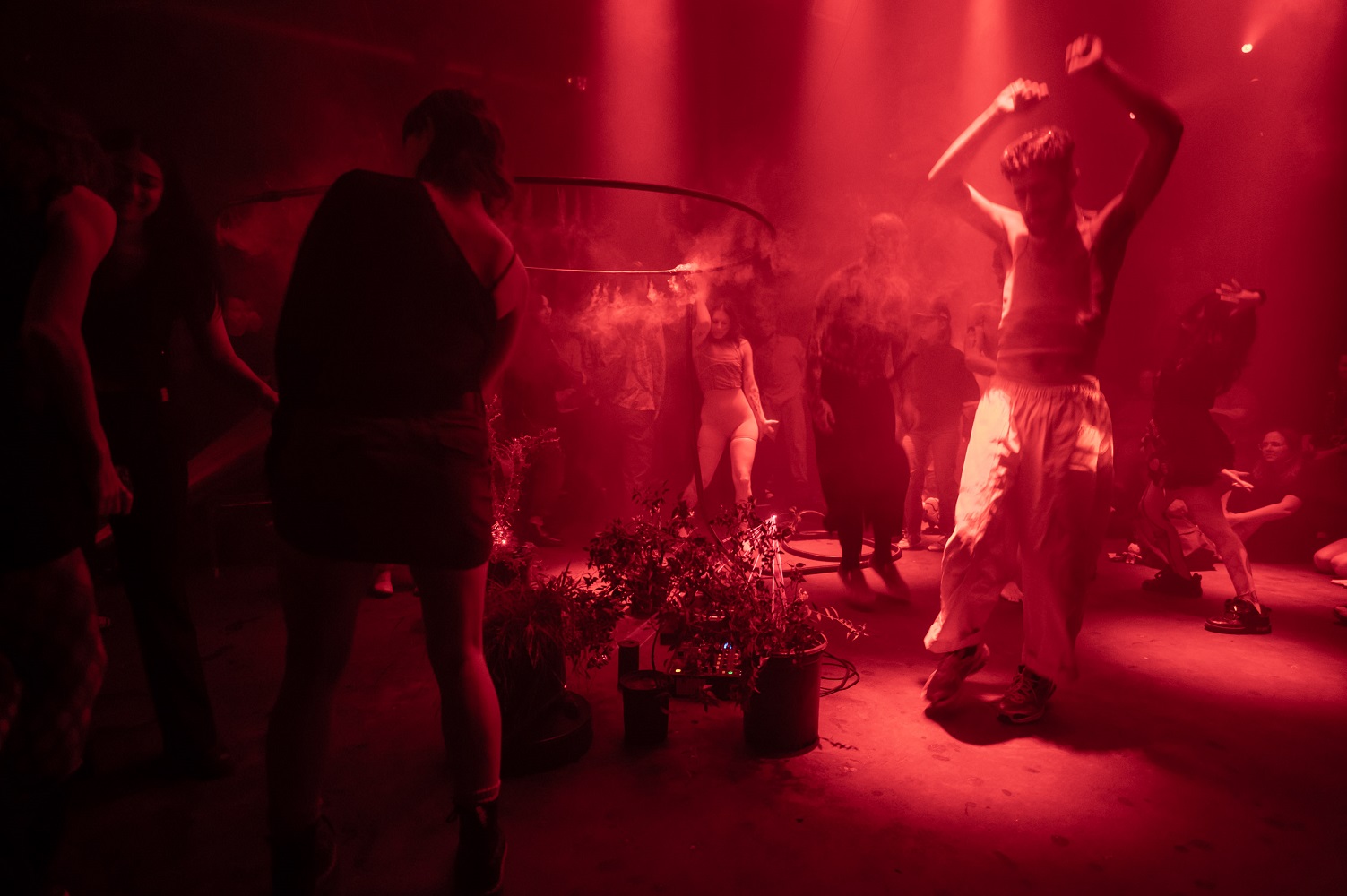 La Pocho Nostra’s performance — made up of Balitronica, Guillermo Gómez-Peña, Sarah Stolar, Elle Mehrmand and Shaghayegh Cyrous — felt the most cohesive aesthetically, fitting nicely into the apartment portion of the nightclub. Performers had a gothic look that fully immersed audience members into the space. The scope of the performance disrupted the tone. Gómez-Peña introduced the piece as his own funeral and traversed the packed space to interact with other performers. Here, the movement and world-building fail in their fight against reality. It is particularly present when he approaches a performer with a drum, conducting the person with a baton. He never quite finds stillness or a confident stance, constantly swaying and shuffling his feet. It reveals a lack of specificity. It becomes difficult to discern who is part of the performance and who just so happens to be shuffling too. The funeral façade fades.