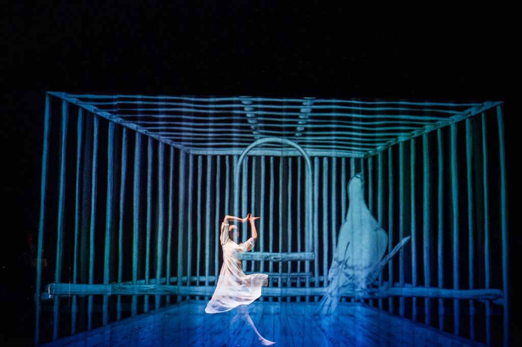 The white board became a screen with dancer Mamiya’s upper body projected as a shadow on the board and her actual legs revealed below. Via excellent timing, the two work in tandem to appear as one attached being and then move in opposite directions. When Mamiya suddenly spins the board, we see a brief image of a dove flying by and the entire background shifts.