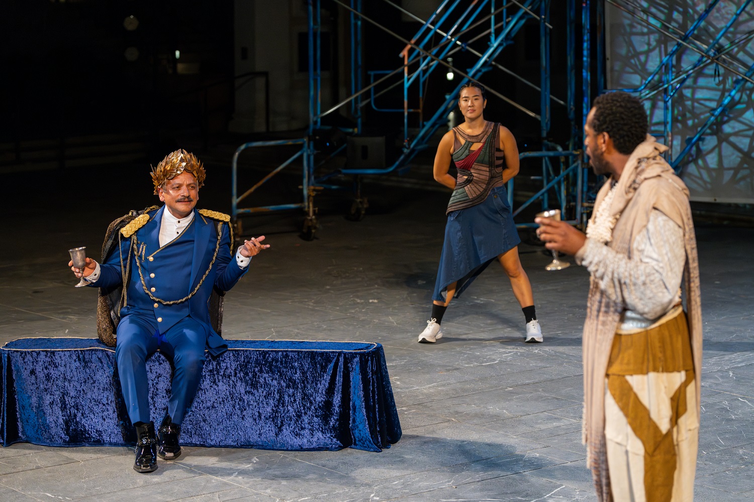 Jesse J. Perez as Priam and Eric Berryman as Memnon in foreground, and Holly Hwang Belshaw as Chorus in background. Photo: © 2024 J. Paul Getty Trust.