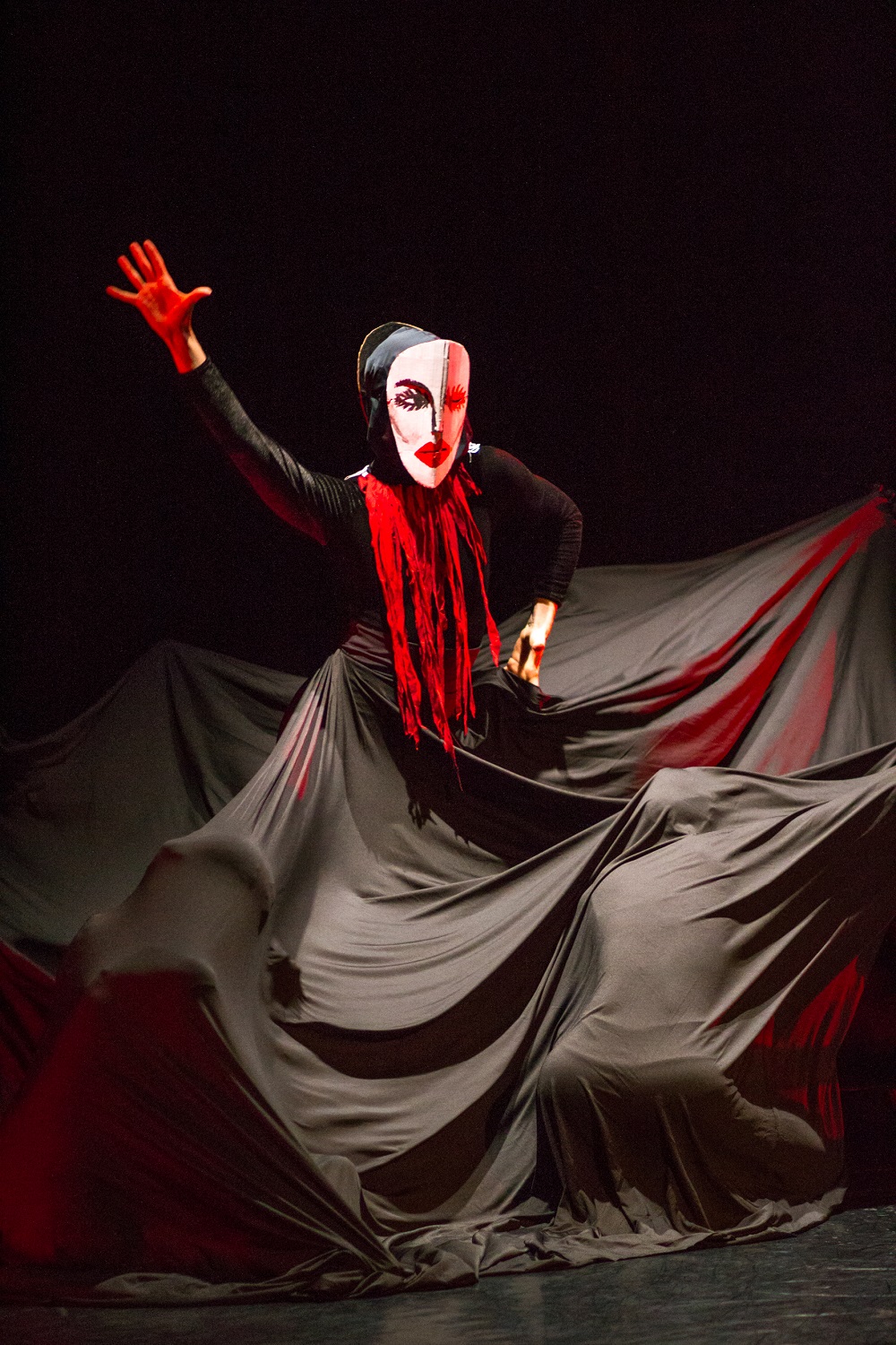 After a lovely introduction by Evans Doede to orient the audience to the artists being represented for the evening, she began the performance with EVE a stunning stylized piece reminiscent of the German School of Modern Dance. So fascinating was the theatrical costuming and choreography representing the stereotypical duality of women as virgin and whore. The concept and movement by Evans Doede, with its strength of vision was a perfect start of the evening. The stark black, white and red costuming by Katrina Amerine and Evans Doede, with Japanese style masks created by the talented and versatile Jenn Logan were of distinct prime colors with expressions that seemed to be caught in mid action. Terje Isungset composed the music, both percussive and perfect. This was a seductive piece that was clearly a statement not only of the times we are living, but indicative of the historic struggle. This led to a poignant dedication, Buried Child, choreographed and powerfully performed by Doede, as a gift to the mothers of Ukraine. It was originally done in 2018.