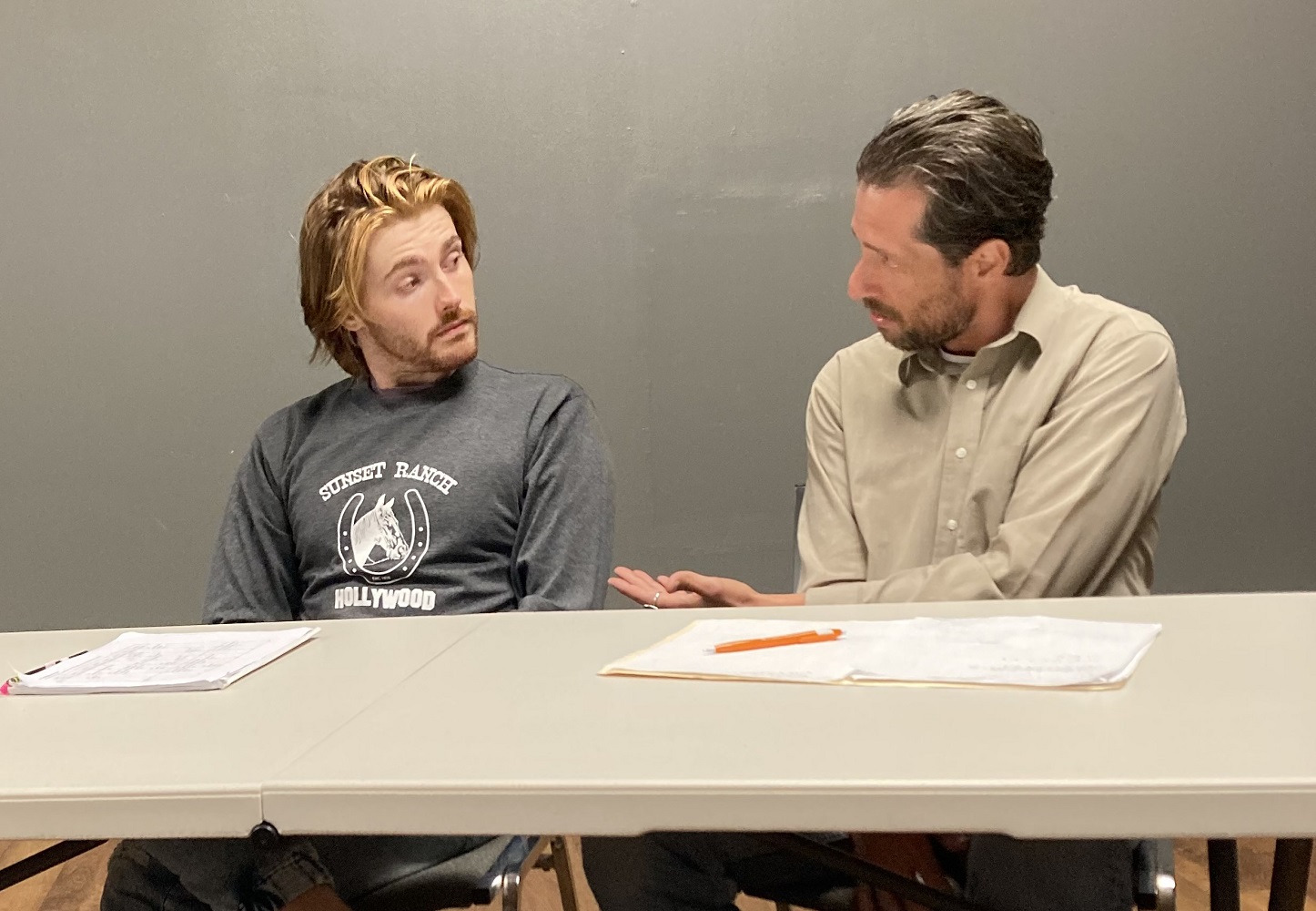 (L-R) Nick Bloch as Dr. Larry Schwartz and Mikel Farber as Ron Gold in rehearsal for SICK – Photo by Peggy Burt