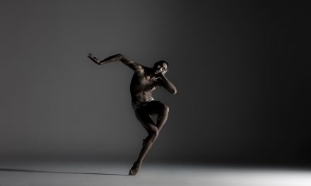 Choreographed by Michelle Shear to the music by Italian composer Ludovico Einaudi, EL TIEMPO CURARÁ had a feeling of separation, isolation and suppressed angst. Costumed in what appeared to be peach colored leotards with skirts that each had unevenly cut hems, three women moved from individual light pools into unison movement that beautifully made use of canon; the same phrase begun two or three beats after each other. The dance was well constructed and performed quite well by Kendyl Fournier, Julia Hamilton, and Antoinette Simental. One translation of the title that I found was “time would heal” and Shear’s work expressed the sense of these three women allowing time to bring about closure.