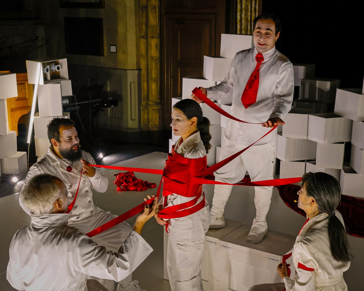 The set and the costumes for “Dracula (Annotated)” are all white. White shipping boxes lined three sides of the stage and bright red sheets of fabric and varying widths of red ribbon pierced through all of that, as blood does when released from the human body. The five white wooden boxes become seats, a train car, a carriage, and coffins for Dracula and his “undead” victims.