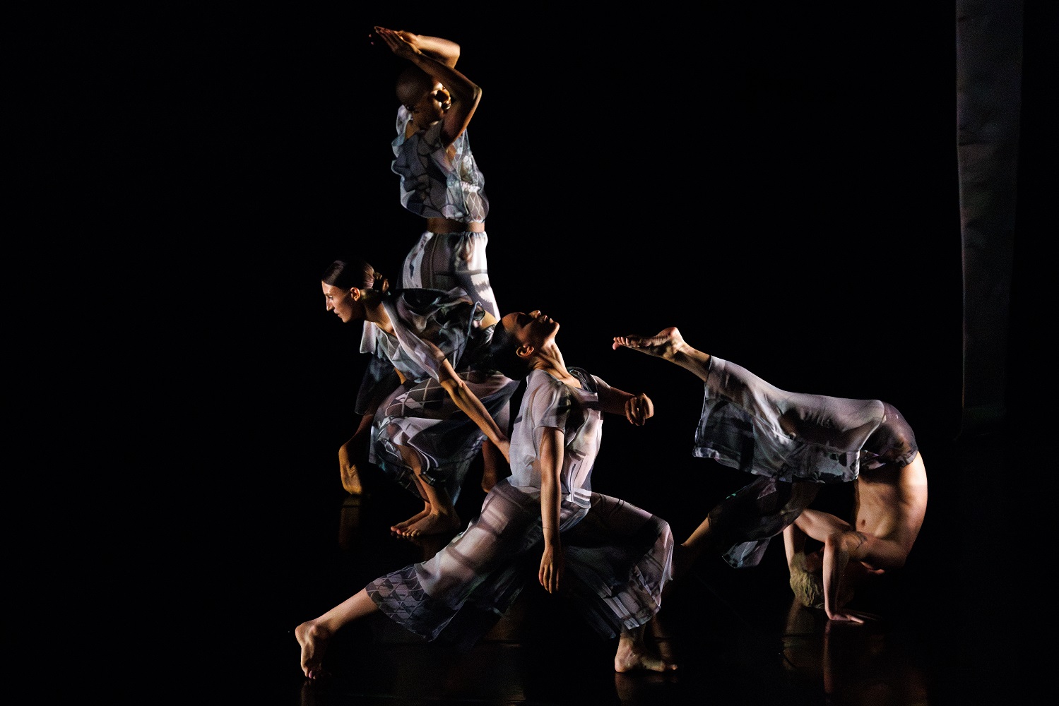 Trisha Brown Dance Company – Set and Reset (1983), Choreography by Trisha Brown – Dancers Catherine Kirk, Ashley Merker, Jennifer Payán, Spencer Weidie – Photo by Ben McKeown, courtesy of the American Dance Festival.