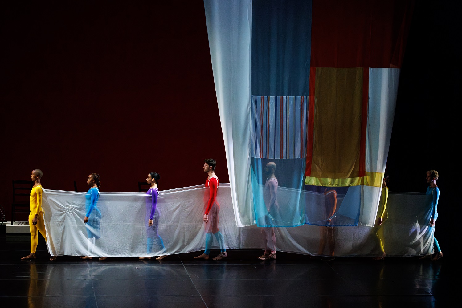 Because the original sets and costumes for both works are the property of museums, TBDC collaborated with the Cunningham Trust to have them reconstructed. Weber feels that the sets and costumes for Travelogue are extraordinary and was thrilled with the material that we found to realize Rauschenberg’s design. “They’re just gorgeous,” she gushed. “They have the same color palette as the originals. I’m very happy!”