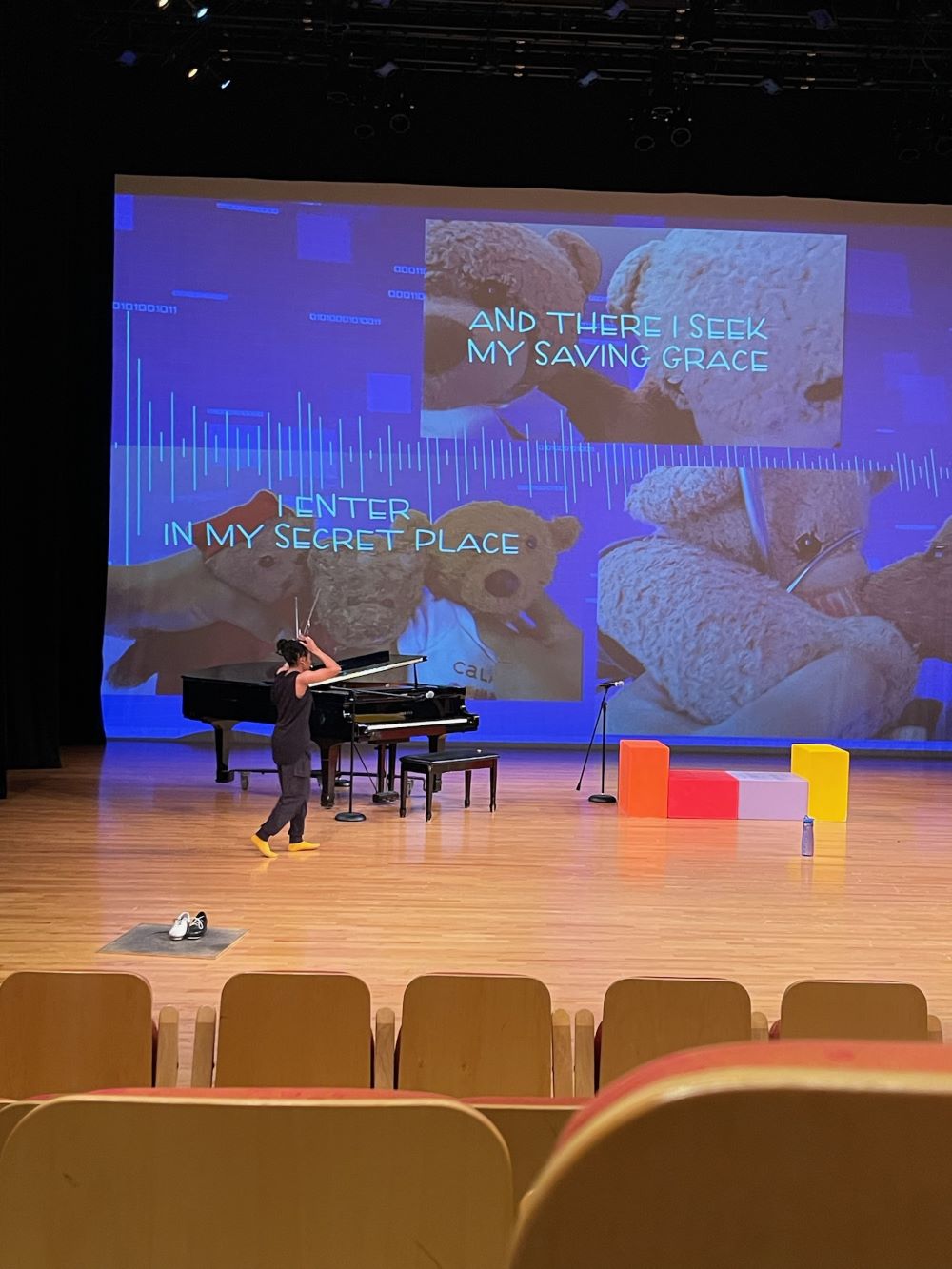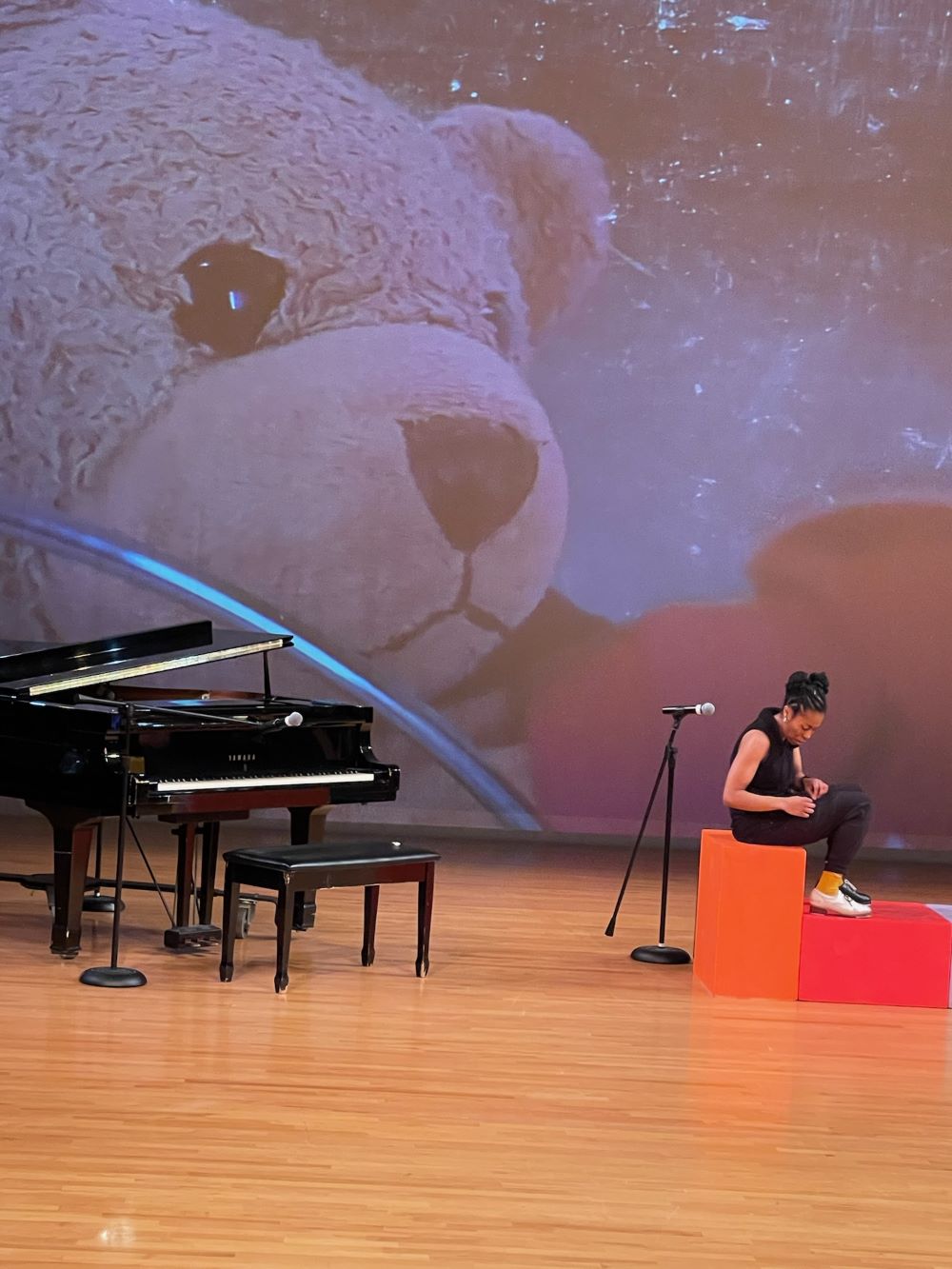 The music and narration that Kyreeana has created is the perfect complement to the dance and projections. When the Bears were featured in the projections and talking, I was distracted by the hands manipulating them however, their dialogue captures the love between the Bears and Kyreeana. The letter to Kyreeana from the Bears is especially charming. “You don’t need a cape to know you’re a hero.” Those words resonated with me. As she sings at the mic, there are times I wish the words were displayed because I could not hear her. The lyrics to the music speak volumes when I can hear them. Sometimes the singing and the piano felt a little disconnected from the story but when she sits down and begins to play piano it is a special moment. The melody she plays is so soothing and peaceful. Is there anything this young woman cannot do?