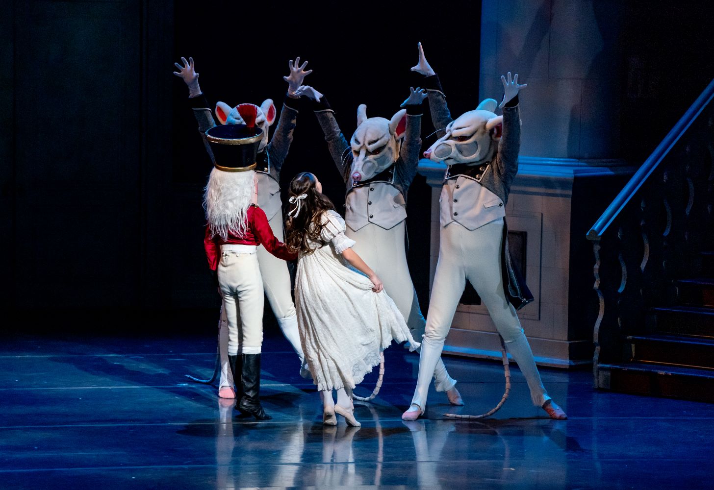 In the opening kitchen and party scene, the company and children were precise in both movement and facial expression. Alexei Agoudine gleamed as Uncle Drosselmeyer, bringing a quirky flair and commanding the stage with ease. Shane Duncan, as Fritz, was notably spunky, while the children at the party were delightfully spirited throughout. Virginia Lensi was polished and refined as Mrs. Stahlbaum, while Brooks Landegger’s Mr. Stahlbaum carried a stately demeanor, smoothly guiding transitions throughout the party.